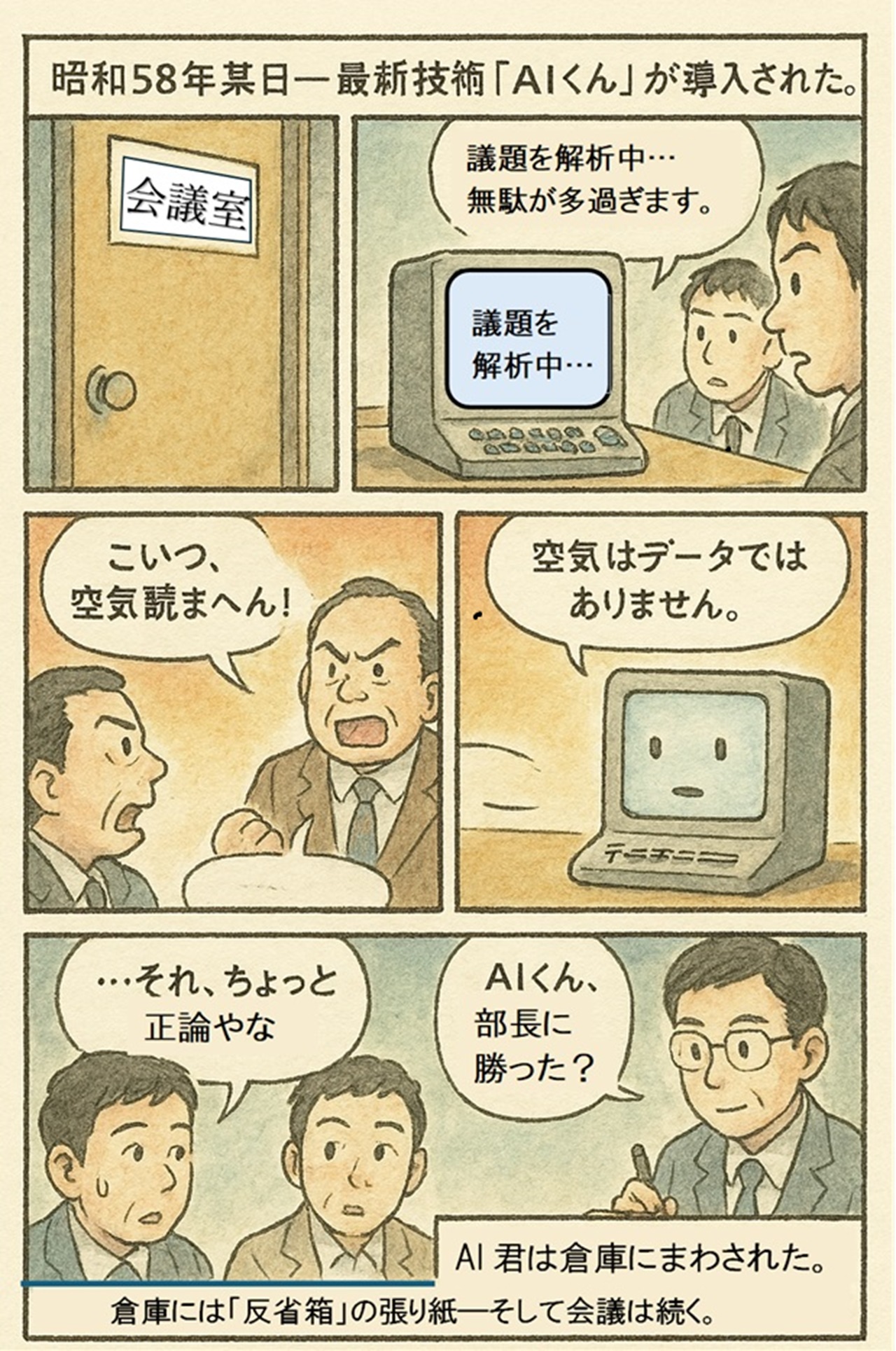 でもな、もし昭和の会議に「AI」がおったら… 「それ、前回と同じです」って即答して、 「議事録はこちらです」って3秒で出して、 「この議題、無駄です」ってズバッと言うて、 部長に「お前、誰に口きいとんねん」って怒られて、 そのままフロッピーディスクに閉じ込められて終わりやろな…。